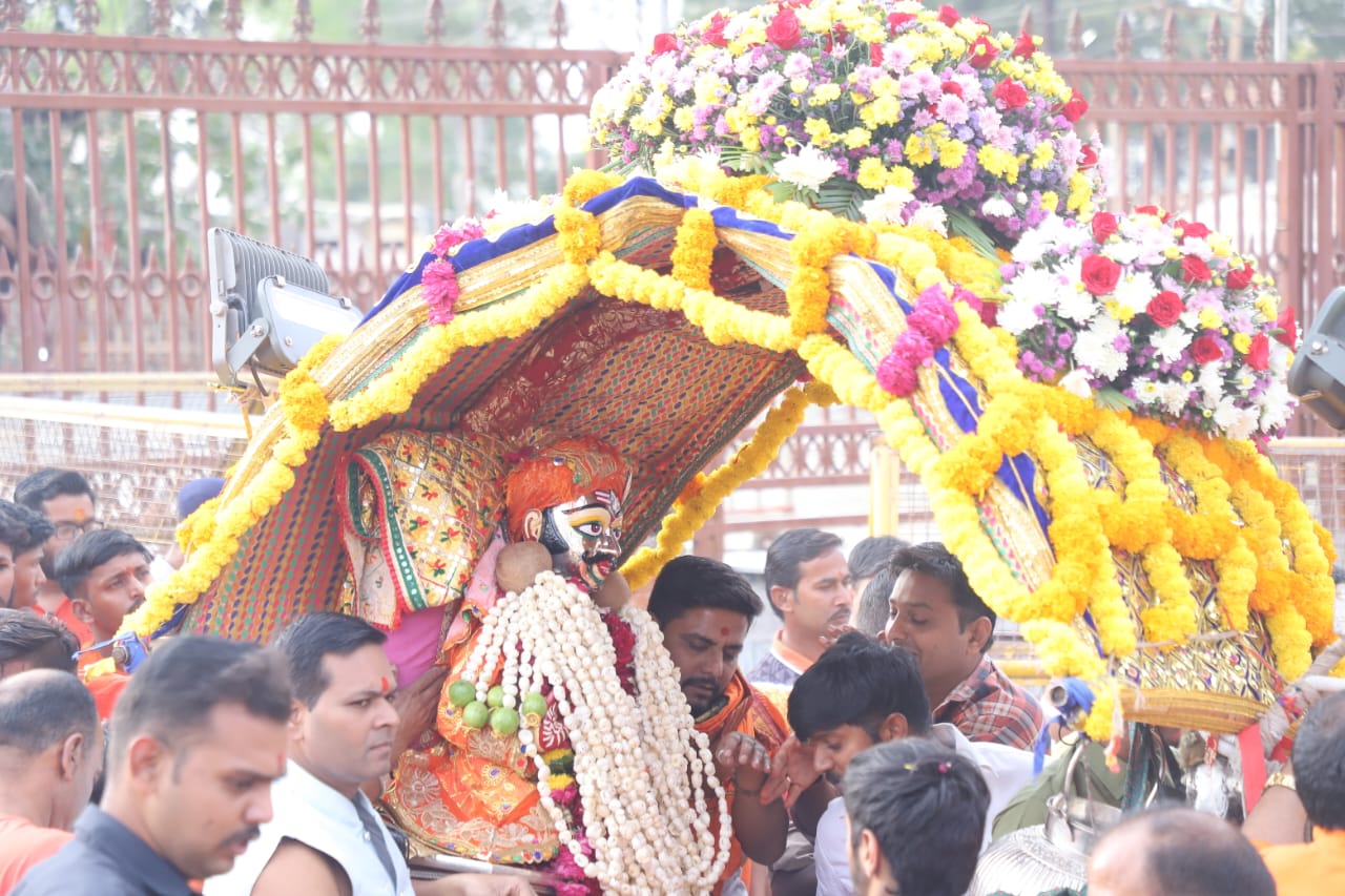 उज्जैन (aditya sharma state beauro of mp)। सिंधिया स्टेट के पंचांग में मतांतर होने से इस बार बाबा महाकाल नए शहर में विजयादशमी पर्व से एक दिन पहले अपने भक्तो को दर्शन देने पहुंचे। महाकाल की सवारी दशहरा के पर्व पर ही साल में एक बार नए शहर आती है। दशहरा मैदान में शमी वृक्ष के नीचे भगवान महाकाल का पूजन अर्चन किया जाता है। सवारी में प्रशासनिक अधिकारी कर्मचारी एवं महाकालेश्वर मंदिर के पुजारी/पुरोहित, गणमान्य नागरिक आदि शामिल हुए थे।